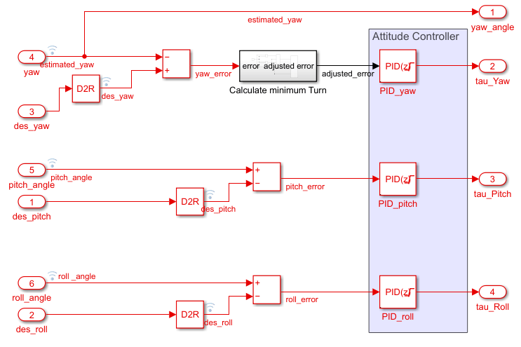 To get the yaw mixer input signal, the subsystem first calculates the yaw error by subtracting the current estimated yaw from the desired yaw. The Calculate minimum Turn block then finds the minimum turning angle by which the UAV can achieve the calculated yaw error, and outputs the yaw error value for that minimum turning angle. The PID Controller (Simulink) block PID_yaw takes the adjusted yaw error as input and outputs the yaw mixer input signal. This example restricts the output of PID_yaw to a range of -0.1 to 0.1 by specifying the Lower limit and Upper limit parameters. This restriction ensures that the yaw mixer input signal the PID Controller block outputs is not too aggressive for the UAV.