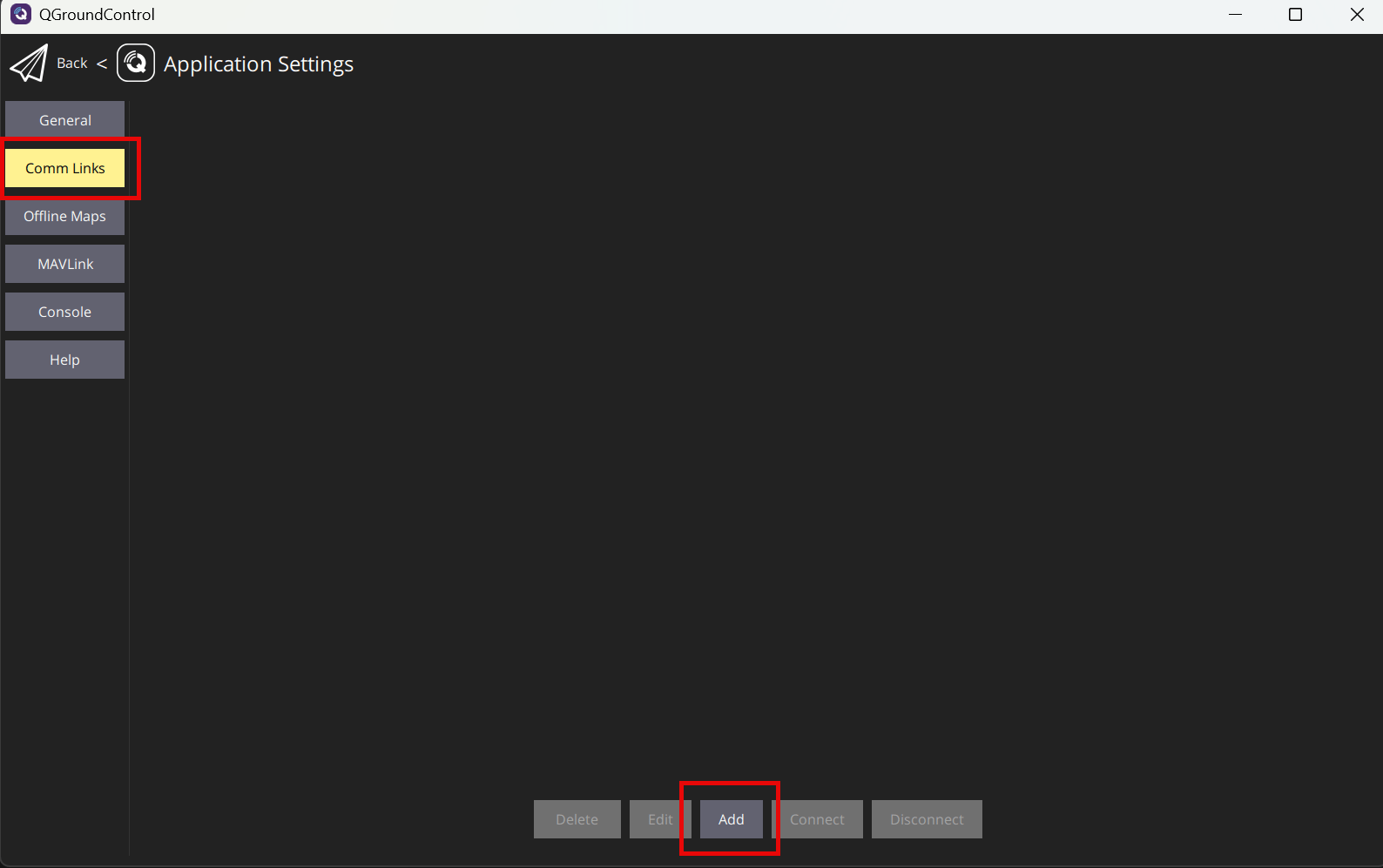 In the Application Settings menu, click Comm Links, then click Add