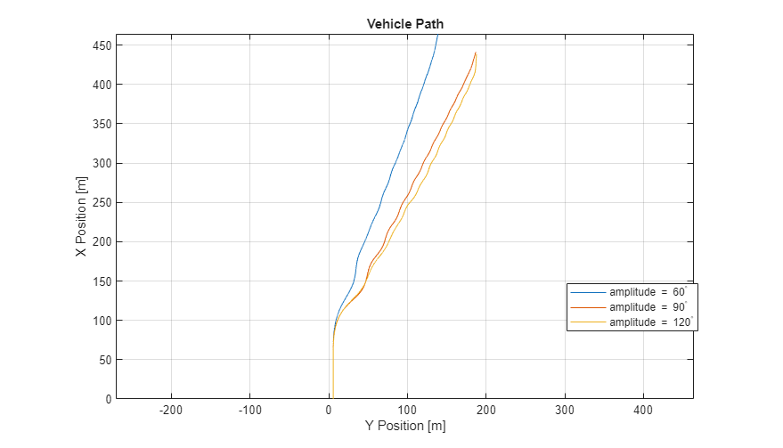 figure for idx = 1:numExperiments % Extract Data log = get(simout(idx),'logsout'); xValues = getSignalsByName(simoutRun(idx), 'Passenger Vehicle:1.Body.InertFrm.Cg.Disp.X').Values; yValues = getSignalsByName(simoutRun(idx), 'Passenger Vehicle:1.Body.InertFrm.Cg.Disp.Y').Values; x = xValues.Data; y = yValues.Data; legend_labels{idx} = ['amplitude = ', num2str(amp(idx)), '^{\circ}']; % Plot vehicle location axis('equal') plot(y,x) hold on end % Add labels to the plots legend(legend_labels, 'Location', 'best'); title('Vehicle Path') xlabel('Y Position [m]') ylabel('X Position [m]') grid on