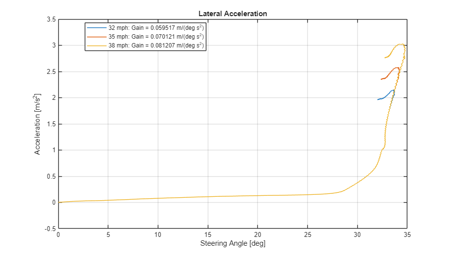 figure for idx = 1:numExperiments % Extract Data log = get(simout(idx),'logsout'); sa=log.get('Steering-wheel angle').Values; ay=log.get('Lateral acceleration').Values; firstorderfit = polyfit(sa.Data,ay.Data,1); gain(idx)=firstorderfit(1); legend_labels{idx} = [num2str(vmax(idx)), ' mph: Gain = ', ... num2str(gain(idx)), ' m/(deg s^2)']; % Plot steering angle vs. lateral acceleration plot(sa.Data,ay.Data) hold on end % Add labels to the plots legend(legend_labels, 'Location', 'best'); title('Lateral Acceleration') xlabel('Steering Angle [deg]') ylabel('Acceleration [m/s^2]') grid on