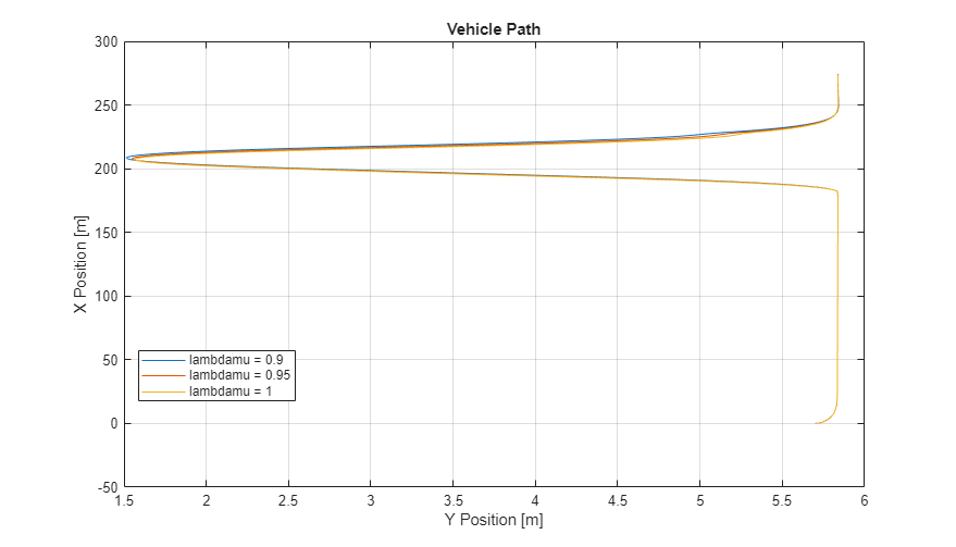 figure for idx = 1:numExperiments % Extract Data log = get(simout(idx),'logsout'); xValues = getSignalsByName(simoutRun(idx), 'Passenger Vehicle:1.Body.InertFrm.Cg.Disp.X').Values; yValues = getSignalsByName(simoutRun(idx), 'Passenger Vehicle:1.Body.InertFrm.Cg.Disp.Y').Values; x = xValues.Data; y = yValues.Data; legend_labels{idx} = ['lambdamu = ', num2str(lambdamu(idx))]; % Plot vehicle location plot(y,x) hold on end % Add labels to the plots legend(legend_labels, 'Location', 'best'); title('Vehicle Path') xlabel('Y Position [m]') ylabel('X Position [m]') grid on