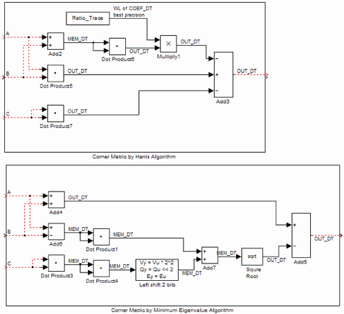 Corner Detection ブロックは、Harris のコーナー検出法 (Harris および Stephens)、最小固有値法 (Shi および Tomasi) または局所強度比較法 (Rosten および Drummond による Accelerated Segment Test, (FAST) 法に基づく) を使用して、イメージ内のコーナーを検出します。このブロックは、コーナー メトリクス値が最も大きいピクセルに基づいてイメージ内のコーナーを検出します。
