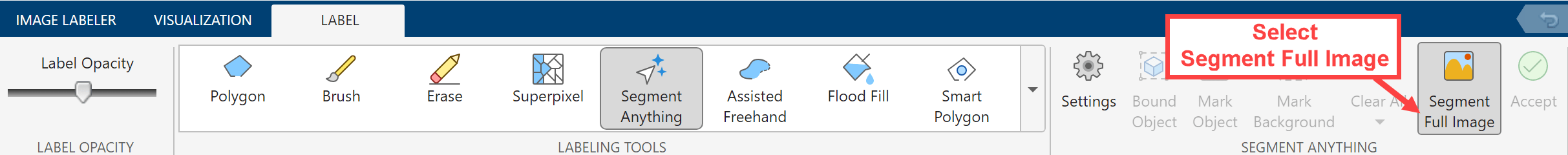 To automatically segment the entire image into regions and select regions to add to the label, on the Label tab of the app toolstrip, in the Segment Anything section, select Segment Full Image.