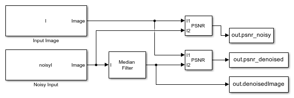 Simulink® モデルを開きます。モデルは、MATLAB ワークスペースから元のイメージとノイズの多いイメージを読み取り、Median Filter ブロックを使用してノイズの多いイメージのノイズを除去します。