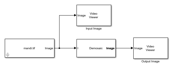 このモデルは、[ファイル名] パラメーターが mandi.tif に設定され、[サンプル時間] パラメーターが inf に設定されたImage From Fileブロックを使用して、入力イメージを読み取ります。このモデルは、入力イメージをデモザイク処理するため、[センサー配置] が BGGR に設定されたDemosaicブロックを使用します。