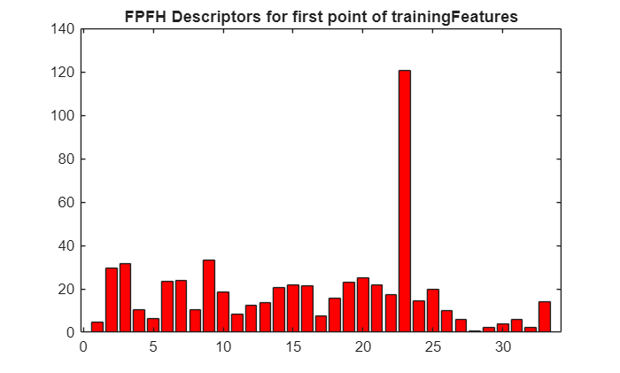 5. FPFH Feature Extraction — Extract FPFH features from the registered input point cloud by using the extractFPFHFeatures (Lidar Toolbox) function. FPFH features enable you to characterize the local geometry of a point in 3-D space by examining its neighboring points. This process involves analyzing each point along with its nearby neighbors and computing a histogram based on the angles between them. The histogram acts as a fingerprint that encapsulates the local geometry around each point, aiding in identifying corresponding points in the target point cloud.