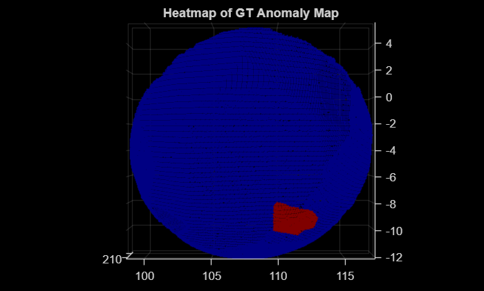 Predict the anomaly score and label mask for the sample test point cloud by using the predictScoreAndMaskForSinglePCD helper function defined at the end of this example. Create a heatmap of the predicted label mask by using the getHeatmapFromMask helper function. Visualize the predicted label mask as a heatmap overlaid on the sample test point cloud data.
