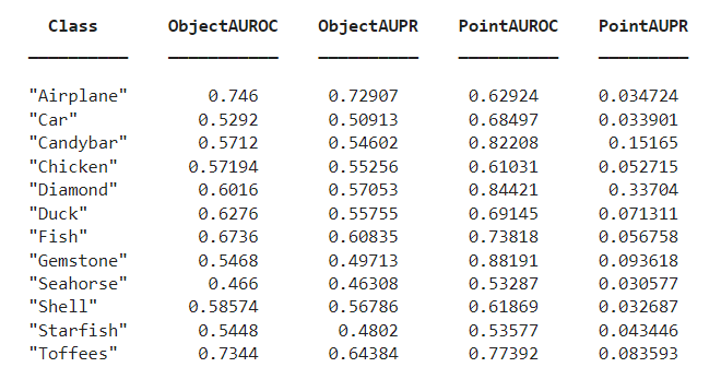 You can compute the object-level and point-level AUC and AUPRC scores for all 12 classes in the data set for a specified memory bank size. Specify the className and memorybankSize values to use to compute the scores. This table describes the object-level and point-level AUC and AUPRC scores for all 12 classes for a memory bank size of 25,000.