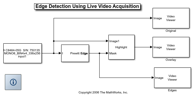 この例では、Image Acquisition Toolbox™ で提供される From Video Device ブロックを使用して、Hamamatsu C8484 カメラから Simulink® にライブのイメージ データを取得する方法を説明します。入力ビデオ ストリーム内のオブジェクトのエッジを検出するには、プレウィット法を適用します。