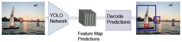 YOLO v2 モデルは、入力イメージに対して深層学習 CNN を実行し、ネットワーク予測を生成します。オブジェクト検出器は予測を復号化し、境界ボックスを生成します。