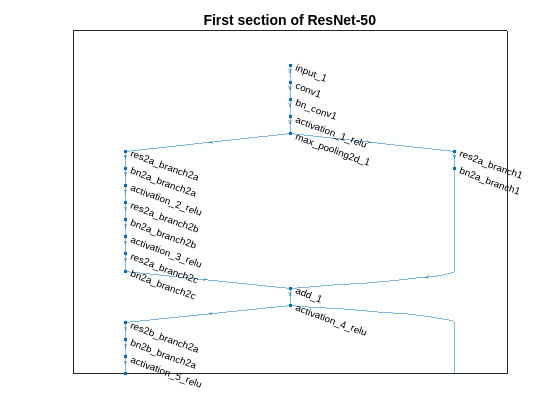 [net, classNames] = imagePretrainedNetwork("resnet50");ネットワークの可視化には、plot を使用します。これは非常に大規模なネットワークであるため、最初のセクションだけが表示されるように表示ウィンドウを調整します。