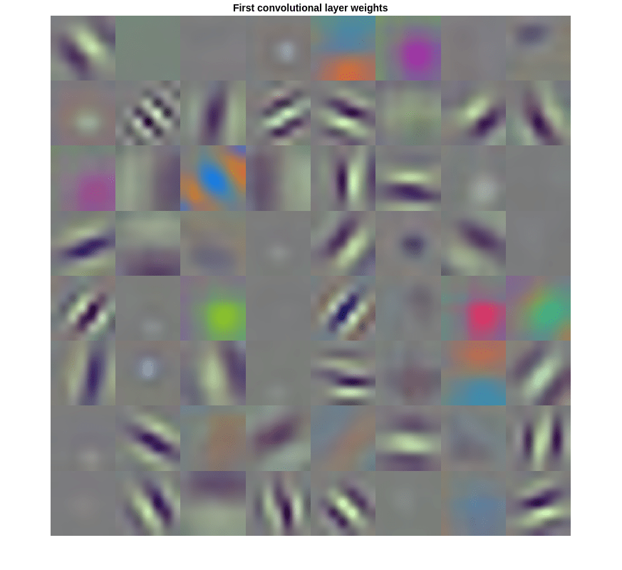 CNN の各層は入力イメージに対する応答または活性化を生成します。ただし、CNN 内でイメージの特徴抽出に適している層は数層しかありません。ネットワークの始まりにある層が、エッジやブロブのようなイメージの基本的特徴を捉えます。これを確認するには、最初の畳み込み層からネットワーク フィルターの重みを可視化します。これにより、CNN から抽出された特徴がイメージの認識タスクでよく機能することが直感的に捉えられるようになります。深層の重みの特徴を可視化するには、Deep Learning Toolbox の deepDreamImage を使用します。