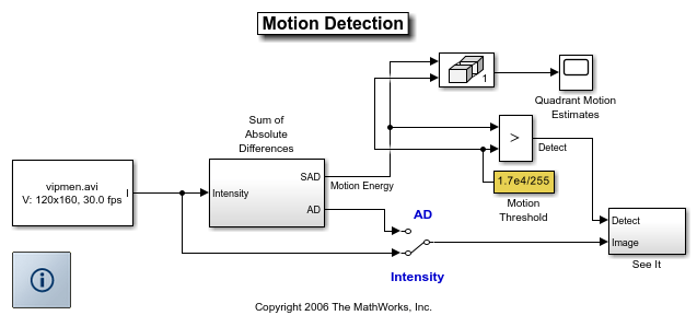 この例では、差の絶対値の和 (SAD) の手法を使用してビデオ シーケンス内の動きを検出する方法を説明します。ビデオ シーケンスの 4 つの象限に対して SAD を別々に適用します。象限内で動きが検出された場合は、その象限を赤で強調表示します。