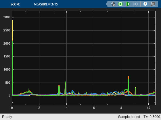 Switch ブロックをダブルクリックして信号を SAD 側に接続すると、Video Viewer ブロックに SAD の値が表示されます。この値は、現在のイメージと前のイメージ間にある差の絶対値を表しています。これらの SAD 値がしきい値を超えると、その象限は赤く強調表示されます。
