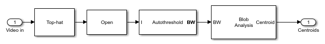 このモデルは Top-hat ブロックを使用して不均一な明るさを排除し、Opening ブロックを使用して針の間の隙間を広くします。全体的なライティングの強度が変化するため、モデルではすべてのビデオ フレームに単一のしきい値を適用することができません。代わりに Autothreshold ブロックを使用して、各フレームのしきい値を計算します。モデルはしきい値を適用して針を別々に分離した後、Blob Analysis ブロックを使って各フレームにある針の数をカウントし、各針の重心を計算します。その後、各フレームにある針の総数を、メイン モデルの Insert Text ブロックに渡します。このブロックは、各ビデオ フレームにこの情報を組み込みます。