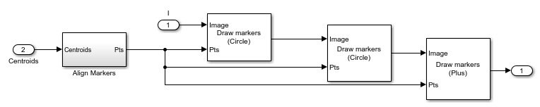 モデルは重心に関する情報を一連の Draw Markers ブロックに渡し、このブロックによって各針の重心がマークされます。