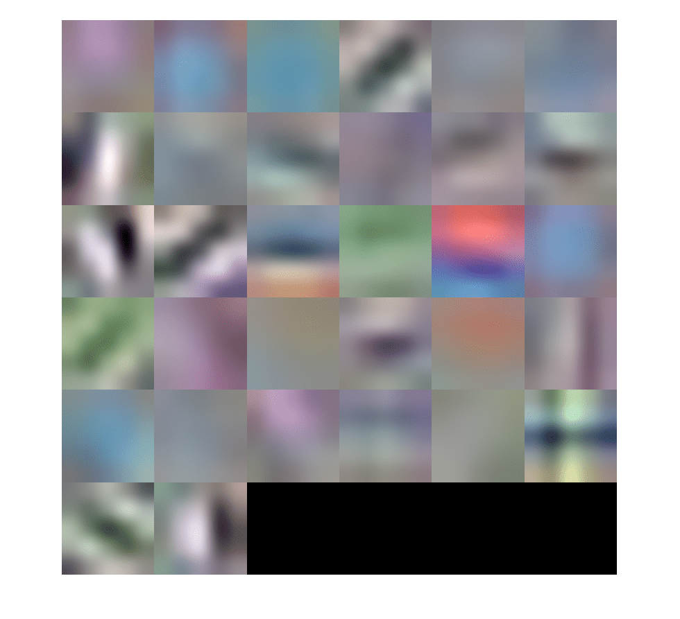 % Extract the first convolutional layer weights w = cifar10Net.Layers(2).Weights; % rescale the weights to the range [0, 1] for better visualization w = rescale(w); figure montage(w)