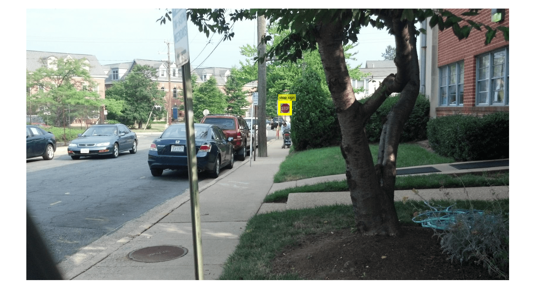 % Only keep the image file names and the stop sign ROI labels stopSigns = stopSignsAndCars(:, {'imageFilename','stopSign'}); % Display one training image and the ground truth bounding boxes I = imread(stopSigns.imageFilename{1}); I = insertObjectAnnotation(I,'Rectangle',stopSigns.stopSign{1},'stop sign','LineWidth',8); figure imshow(I)