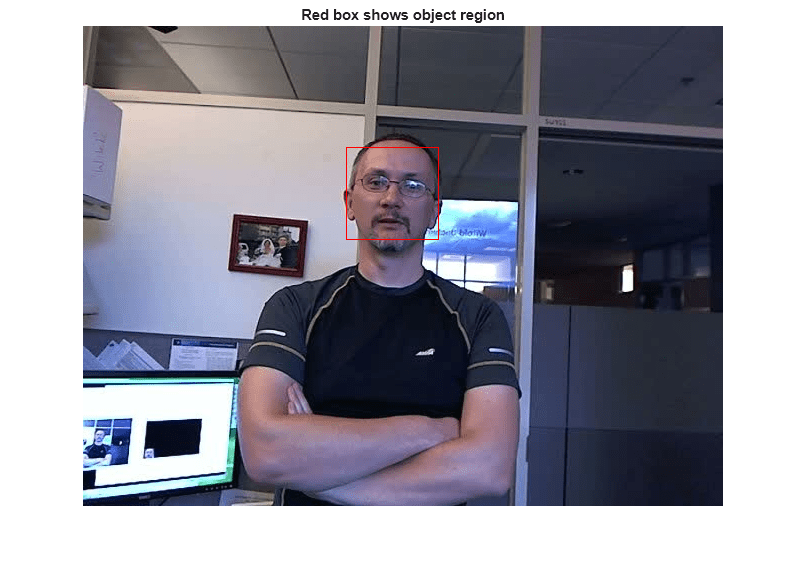 objectImage = insertShape(objectFrame,'rectangle',objectRegion,'ShapeColor','red'); figure; imshow(objectImage); title('Red box shows object region');