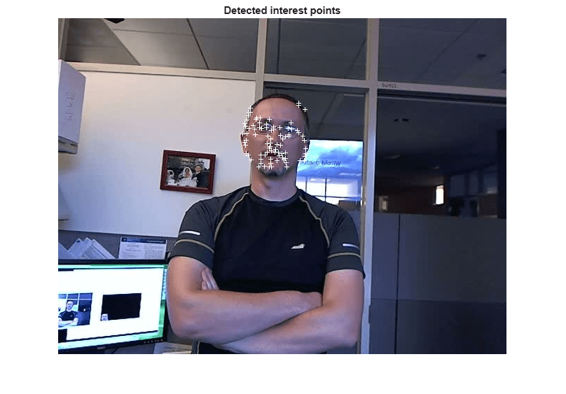 pointImage = insertMarker(objectFrame,points.Location,'+','MarkerColor','white'); figure; imshow(pointImage); title('Detected interest points');