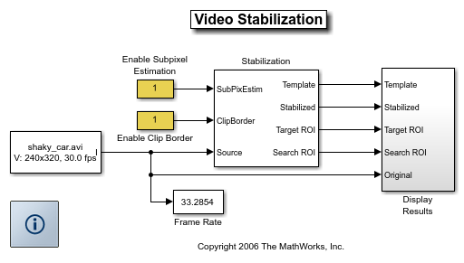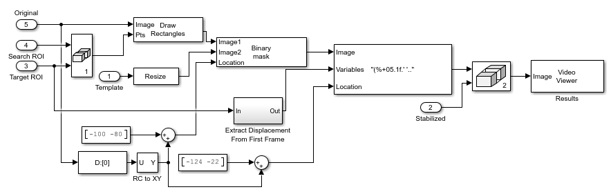 モデルは Template Matching ブロックを使用して探索領域上でターゲットを動かし、各位置における差の絶対値の和 (SAD) を計算します。最小の SAD 値をもつ位置が、ビデオ フレーム内でのターゲットの位置に対応します。この位置情報を基に、モデルはターゲットとその元の位置の間で変位ベクトルを計算します。Stabilization サブシステムの Translate ブロックは、このベクトルを使用して各フレームをシフトさせ、ビデオ ストリームからカメラの動きを排除します。