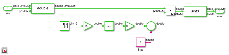 The impairment in this model is brightness modulation using a slow sine wave. Since the impairment is modeled purely behaviorally, the first step is to convert the image to double-precision values. The 16-bit counter counts up at the frame rate and the counter value is multiplied by 2*pi/40. The sine wave output is scaled down by 0.3 and a bias of 1.0 is then added. These calculations result in a +/-30% change in brightness over a period of 40 frames. After applying the impairment, the model converts back to uint8 by using rounding with saturation.