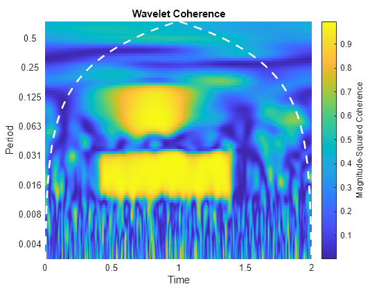 出力引数なしで wcoherence(___) を使用すると、ウェーブレット コヒーレンスと円錐状影響圏が現在の Figure にプロットされます。周波数と周期の逆関数の関係により、サンプリング間隔を使用したプロットはサンプリング周波数を使用したプロットの逆になります。サンプリング周波数を使用したプロットには、コヒーレンスが 0.5 を超える領域について、x に対する y の位相遅れを示す矢印が表示されます。矢印の間隔は時間とスケールに対応します。矢印の方向は単位円上の位相遅れに対応します。たとえば、垂直な矢印は π/2 または 1/4 サイクルの位相遅れを示します。対応する時間の遅れはサイクルの期間によって異なります。