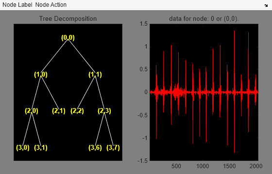 Plot the tree again, and view the data at the root node. The plot shows the reconstruction of the signal after setting the coefficients at the three terminal nodes to 0.