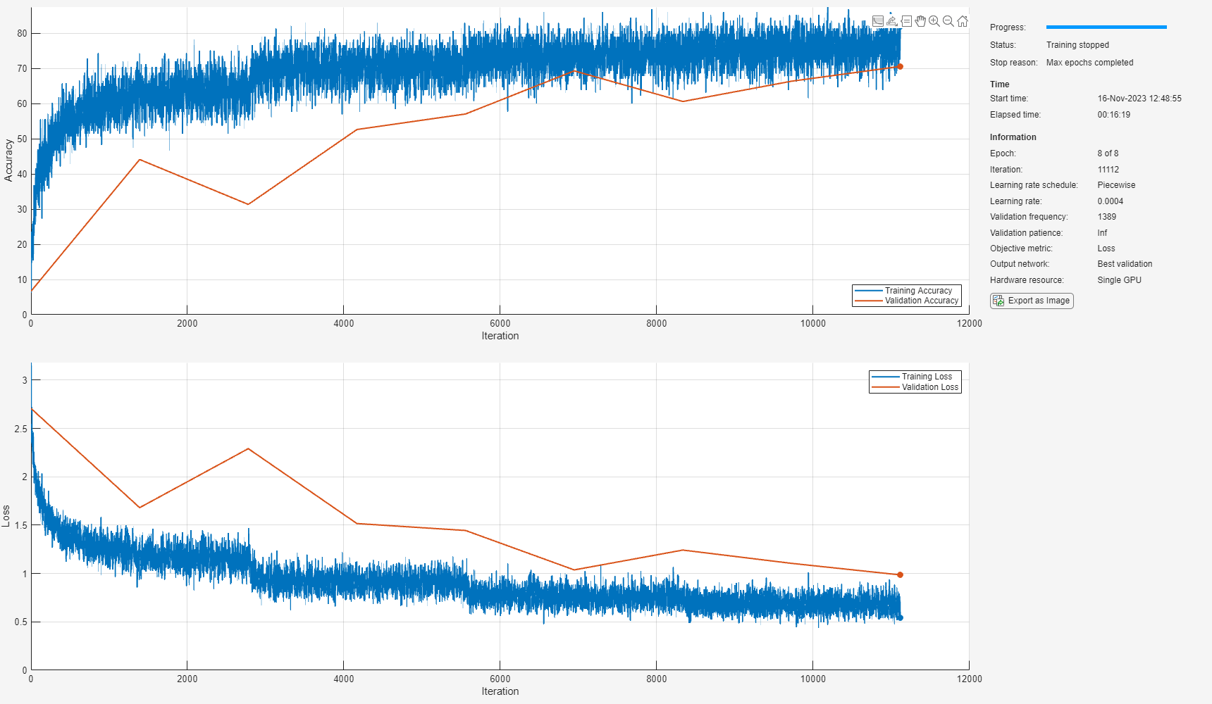 miniBatchSize = 128; tuneme = 128; lr = 0.05*miniBatchSize/tuneme; options = trainingOptions( ... "sgdm", ... Momentum=0.9, ... L2Regularization=0.005, ... ... MiniBatchSize=miniBatchSize, ... MaxEpochs=8, ... Shuffle="every-epoch", ... ... Plots="training-progress", ... Verbose=false, ... Metrics="accuracy", ... ... InitialLearnRate=lr, ... LearnRateSchedule="piecewise", ... LearnRateDropPeriod=2, ... LearnRateDropFactor=0.2, ... ... ValidationData={xTest,yTest}, ... ValidationFrequency=floor(size(xTrain,4)/miniBatchSize));