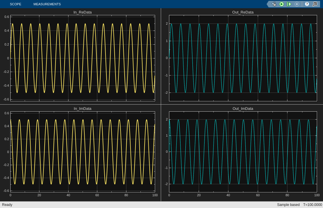 [data_Data_Out,numberOfSamples_Data_Out,overflow_Data_Out] = readPort(dut,"Data_Out");Verify that there is no overflow and the number of valid samples is equal to the number of samples requested from the radio.