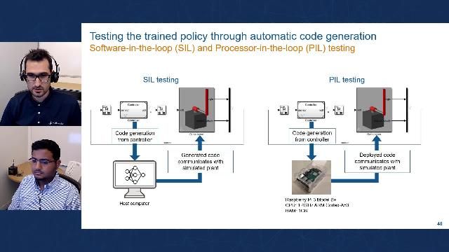 学習環境を Simulink (または MATLAB) でモデル化し、ハードウェアが損傷を受けるリスクを低減します。RL Agent ブロックを使用して、環境モデルと深層強化学習エージェントをシームレスに統合します。逐次処理または並列処理で方策の学習を行い、(システムレベルの) シミュレーションと SIL (ソフトウェアインザループ)/HIL (ハードウェアインザループ) テストを用いて検証します。学習済みの方策を組み込みデバイスまたはクラウドに展開します。